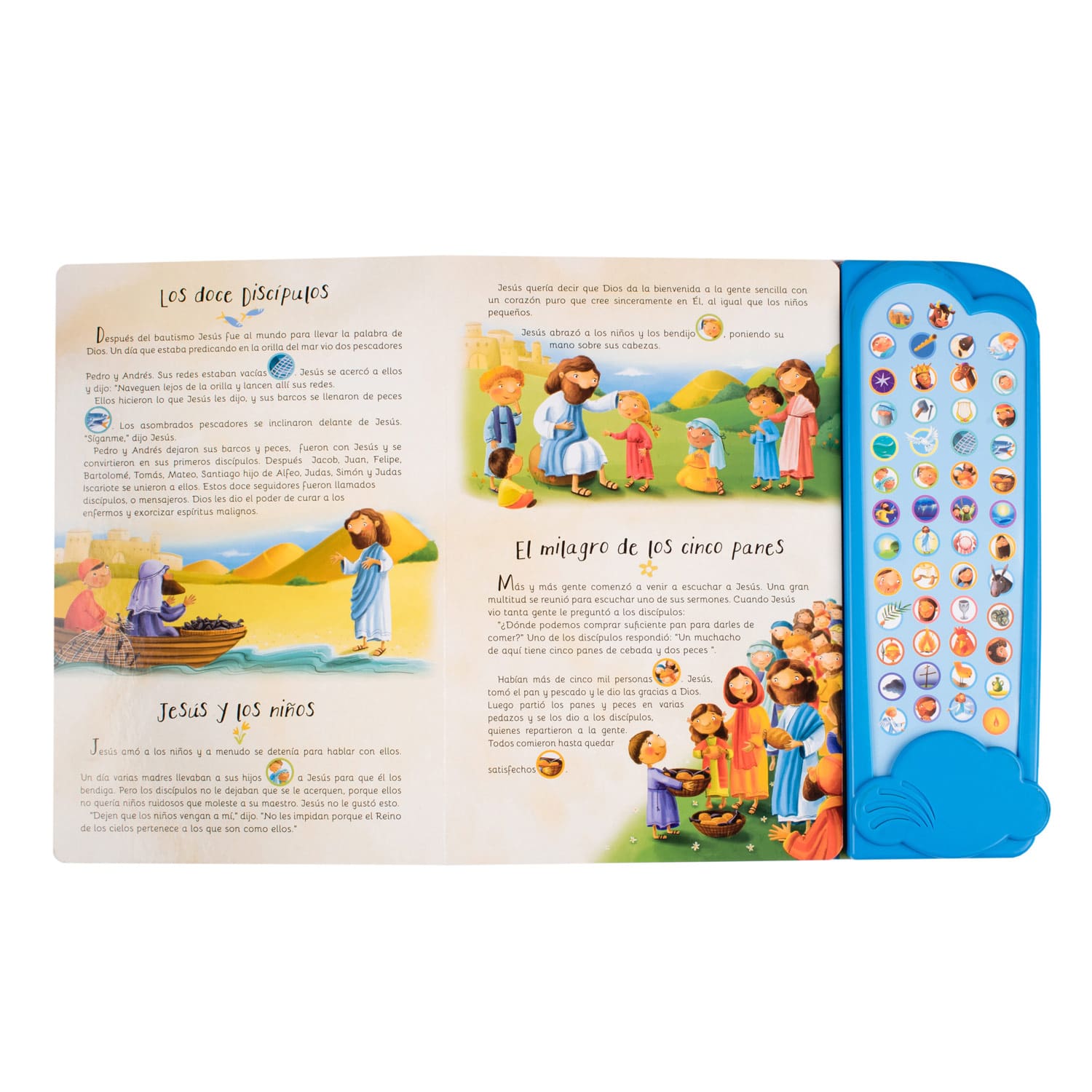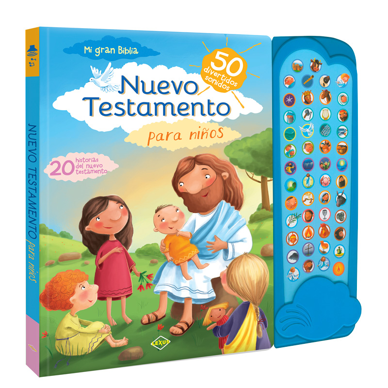 20 Historias del Nuevo Testamento para que los niños conozcan sobre el nacimiento y la vida de Jesús, sus milagros y su resurrección. Cada página está acompañada de ilustraciones, texto y 50 sonidos, que harán de la lectura un momento muy especial.