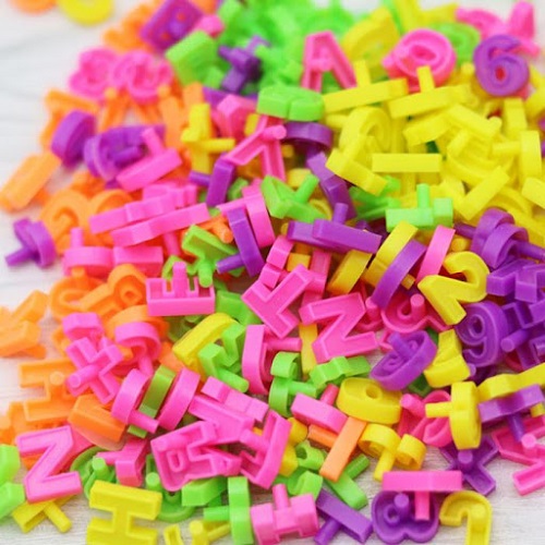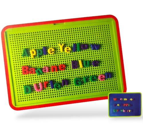 6674 *Caja c/PIJAS de LETRAS MAYÚSCULAS Y MINÚSCULAS* (30×22 cm.) Tablero +170 Pijas.