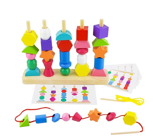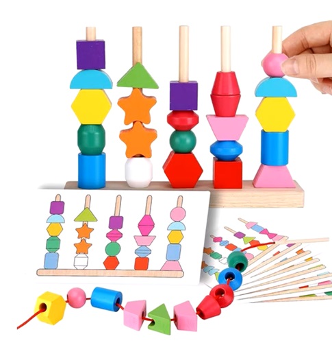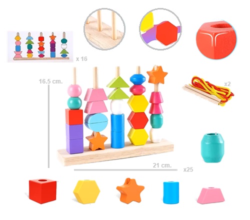 9704 *APILADOR GEOMÉTRICO Y PARA ENHEBRAR 5 Columnas de Madera* (22×17 cm.) 28 Pcs.