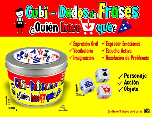 MD700 *Dados de Frases; ¿Quién, hace, qué? Estuche Metálico (9×2 cm.) c/3 Dados (18mm.)